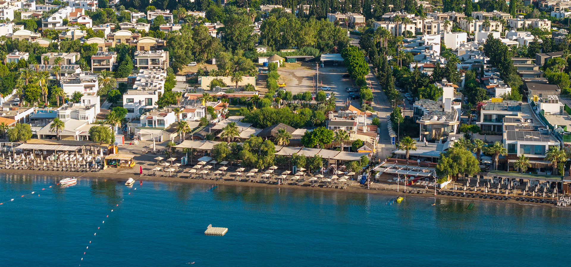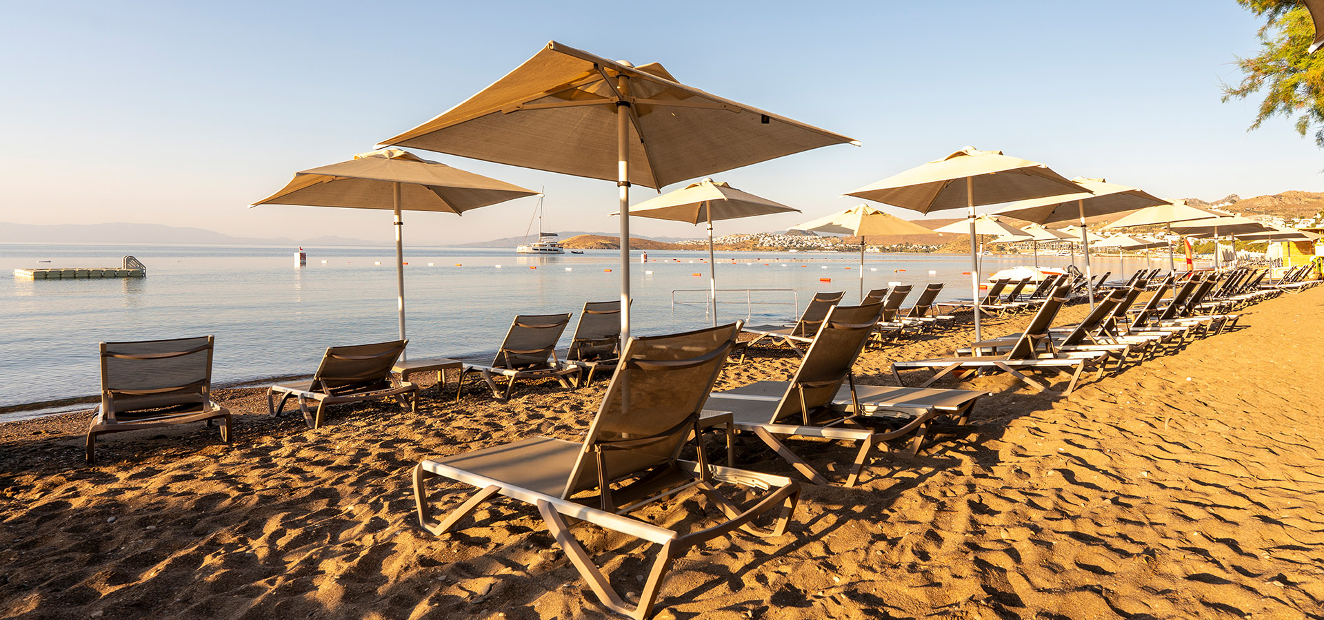Bodrum’un en güzel koylarından mavi bayrak ödüllü yahşi plajında Kefi Beach’in kendi özel çim ve kum alanlarıyla turkuaz rengi denizin serinliğinde ferahlayın.